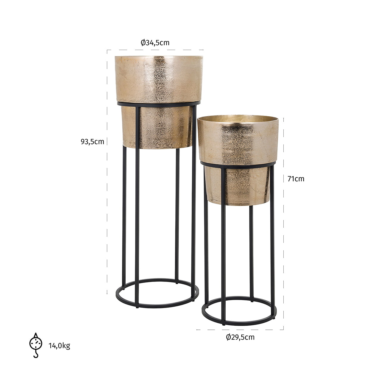 Als je jouw interieur wilt verfraaien met een uniek en veelzijdig decoratief accessoire, dan is de Richmond Plantenbak Lowen de perfecte keuze! Deze prachtige set bestaat uit twee goudkleurige aluminium plantenbakken, elk geplaatst op een stevige zwartkleurige standaard. De combinatie van deze materialen zorgt voor een uitzonderlijke robuustheid en duurzaamheid, waardoor de plantenbakken perfect geschikt zijn voor elke decoratieve stijl.