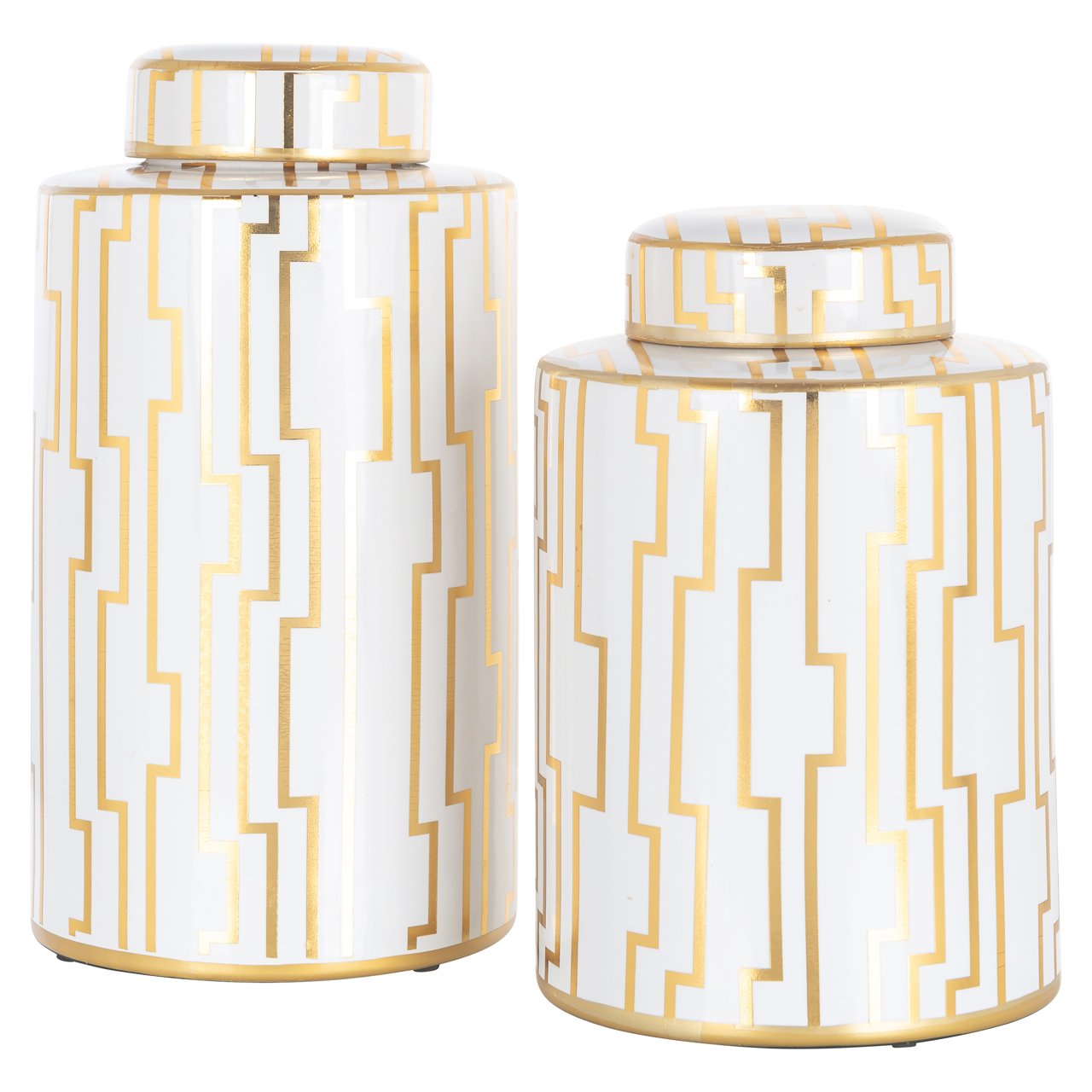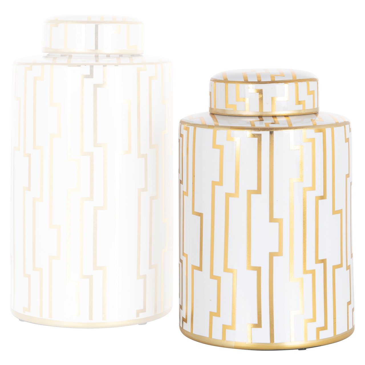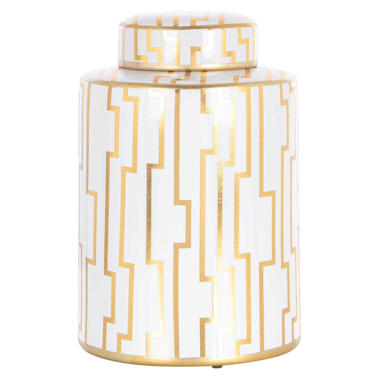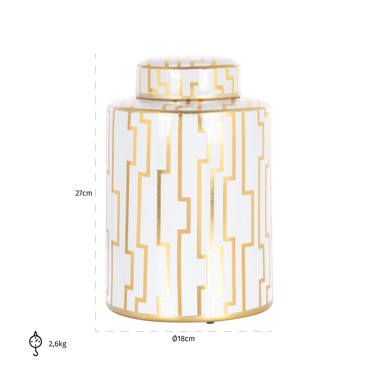 Voeg een vleugje glamour toe aan uw interieur met de prachtige Richmond Pot Jamila Klein! Deze schitterende pot met deksel is een ware blikvanger in elke ruimte. Vervaardigd van hoogwaardig keramiek en voorzien van een verfijnd goud-wit patroon, straalt de Richmond Pot Jamilia Klein een tijdloze elegantie uit. De goudkleurige randen zorgen voor een luxe uitstraling, waardoor deze pot een echt kunstwerk wordt dat uw interieur een stijlvolle allure geeft. De pot is tevens verkrijgbaar in een grotere variant.