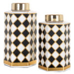 Laat uw interieur stralen met de Richmond Pot Pip Klein! Deze betoverende pot met deksel is een ware blikvanger in elke ruimte. Vervaardigd uit hoogwaardig keramiek en verfraaid met een schitterend zwart-wit-goud patroon, voegt de Richmond Pot Pip Klein een vleugje glamour en luxe toe aan uw huis. De goudkleurige randen geven deze pot een elegante en verfijnde uitstraling, waardoor het een kunstwerk op zichzelf wordt.