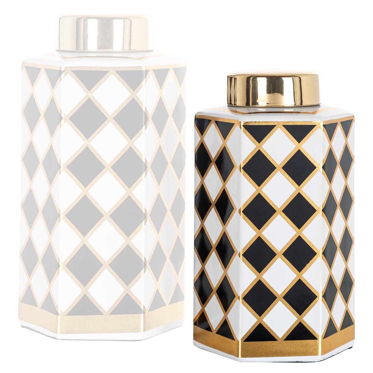Laat uw interieur stralen met de Richmond Pot Pip Klein! Deze betoverende pot met deksel is een ware blikvanger in elke ruimte. Vervaardigd uit hoogwaardig keramiek en verfraaid met een schitterend zwart-wit-goud patroon, voegt de Richmond Pot Pip Klein een vleugje glamour en luxe toe aan uw huis. De goudkleurige randen geven deze pot een elegante en verfijnde uitstraling, waardoor het een kunstwerk op zichzelf wordt.