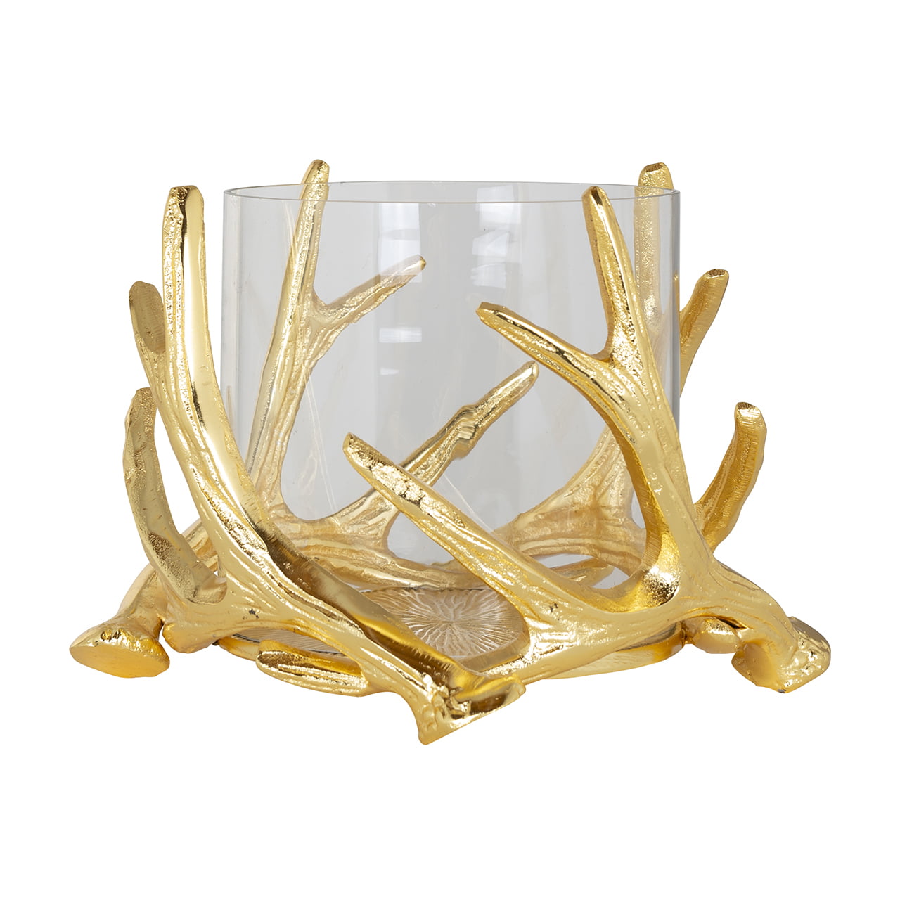 Dit windlicht is vervaardigd van helder glas en omhuld door een goudkleurig aluminium frame in de vorm van sierlijke geweien. Deze opvallende designdetails creëren een harmonieuze combinatie van materialen en vormen, wat resulteert in een visueel aantrekkelijk stuk dat onmiddellijk de aandacht trekt.