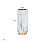 Een opvallend kenmerk van deze vaas is de goudkleurige rand aan de onderzijde, die een vleugje glamour en elegantie toevoegt aan het geheel. Deze subtiel aangebrachte gouden details vormen een perfect contrast met het witte marmerachtige oppervlak.