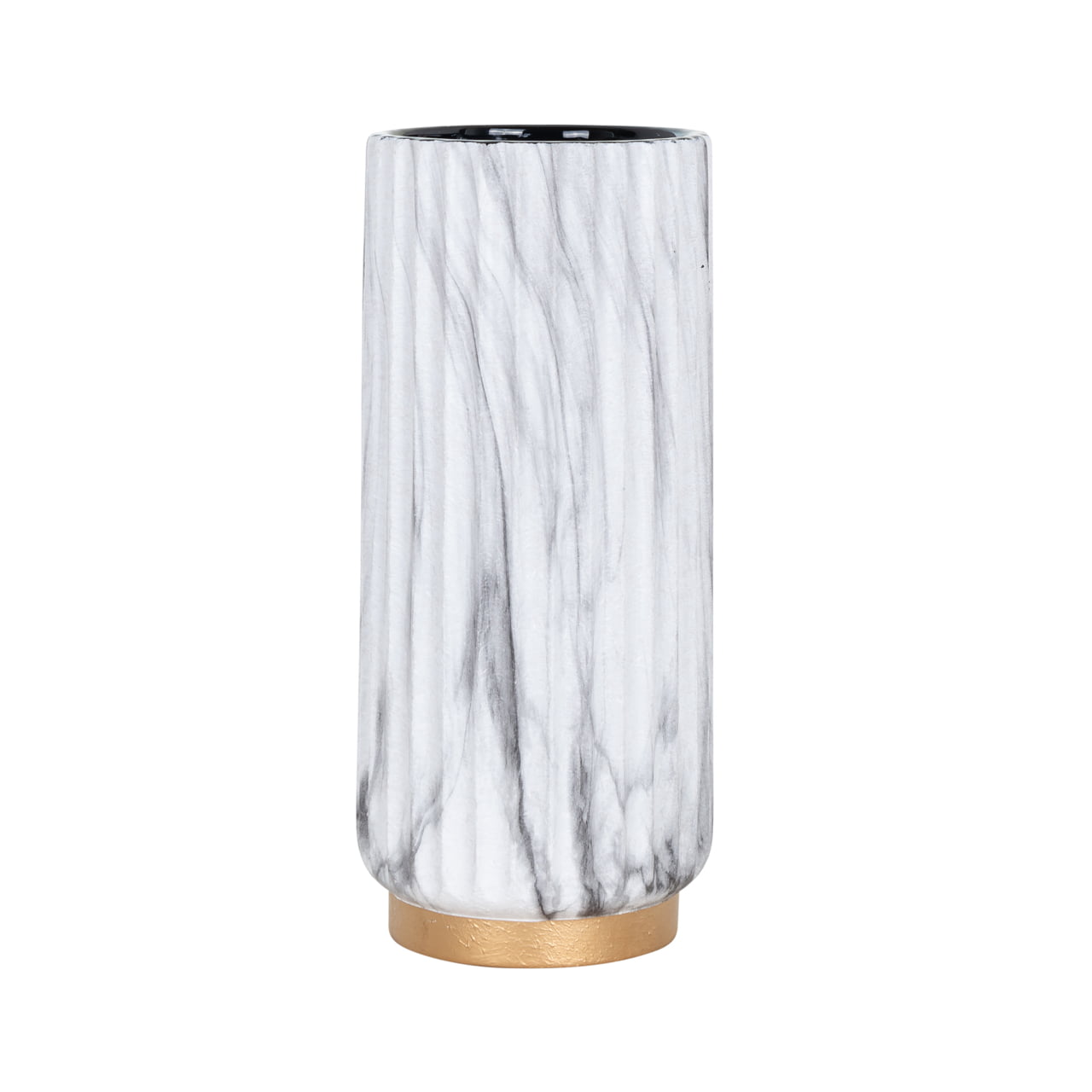 Een opvallend kenmerk van deze vaas is de goudkleurige rand aan de onderzijde, die een vleugje glamour en elegantie toevoegt aan het geheel. Deze subtiel aangebrachte gouden details vormen een perfect contrast met het witte marmerachtige oppervlak.