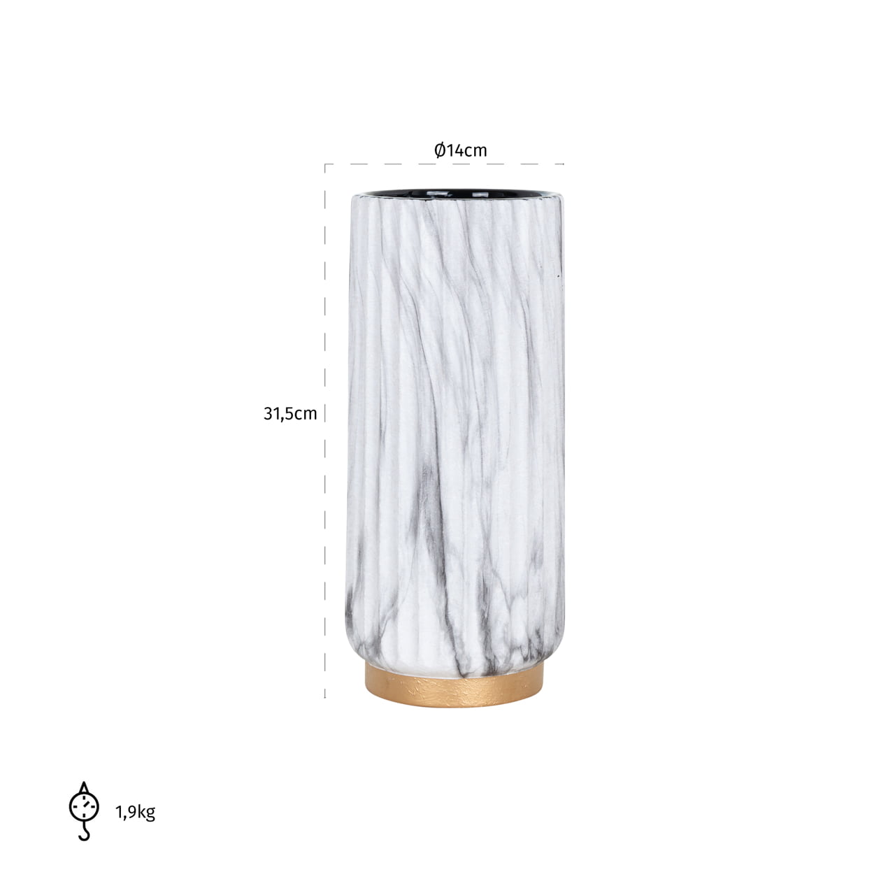 De Richmond Vaas Kenji Groot is een ware blikvanger, met zijn verfijnde witte marmerlook die een gevoel van luxe en tijdloosheid uitstraalt. De keramische structuur en de zorgvuldig bewerkte ribbels geven de vaas een textuur en diepte die het tot een kunstwerk op zich maken.