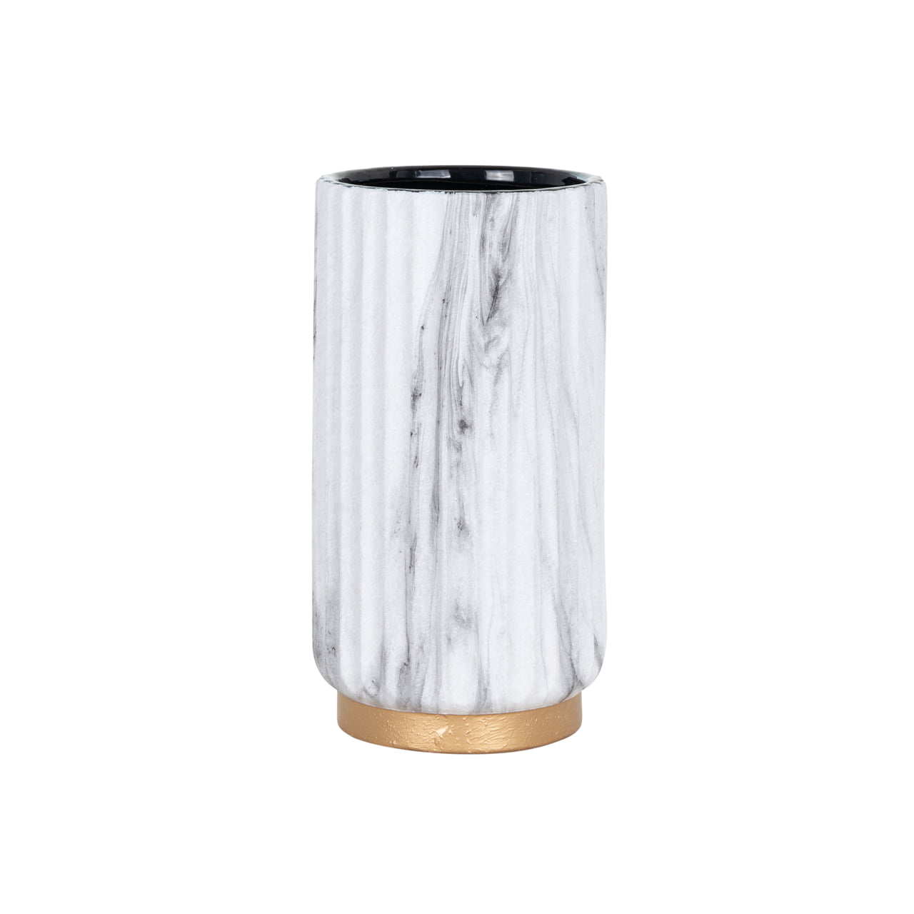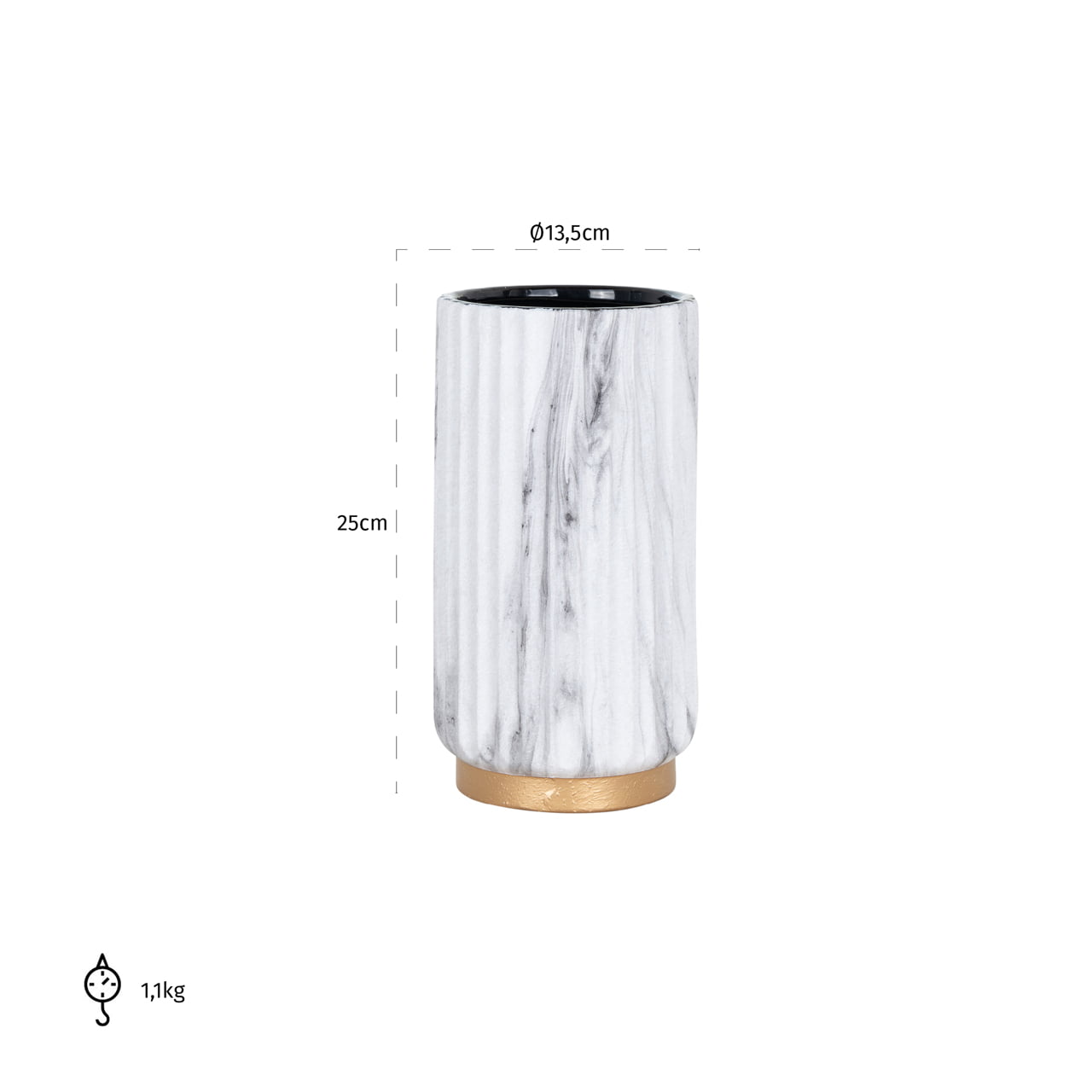 Een opvallend kenmerk van deze vaas is de goudkleurige rand aan de onderzijde, die een vleugje glamour en elegantie toevoegt aan het geheel. Deze subtiel aangebrachte gouden details vormen een perfect contrast met het witte marmerachtige oppervlak.