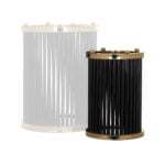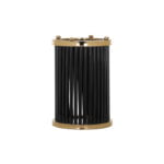 Dit windlicht combineert een glanzend goudkleurig aluminium frame met zwarte buizen, wat zorgt voor een uniek lichteffect wanneer het licht door de buizen schijnt. Het contrast tussen het goud en zwart geeft een verfijnde uitstraling en voegt een vleugje luxe toe aan je omgeving.