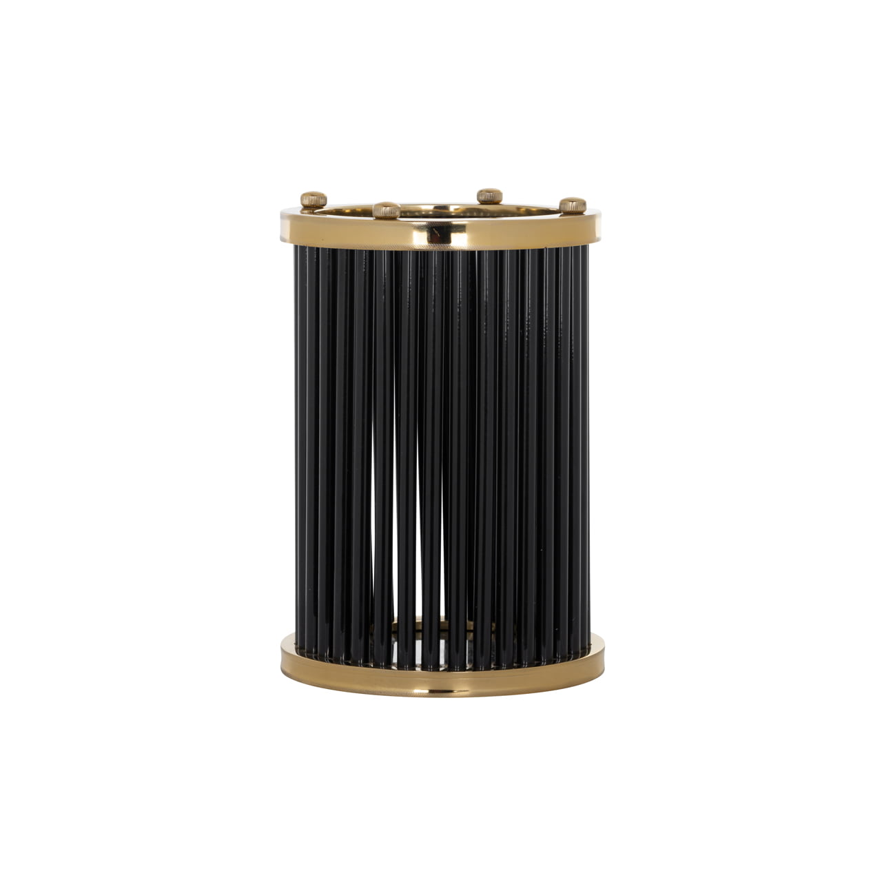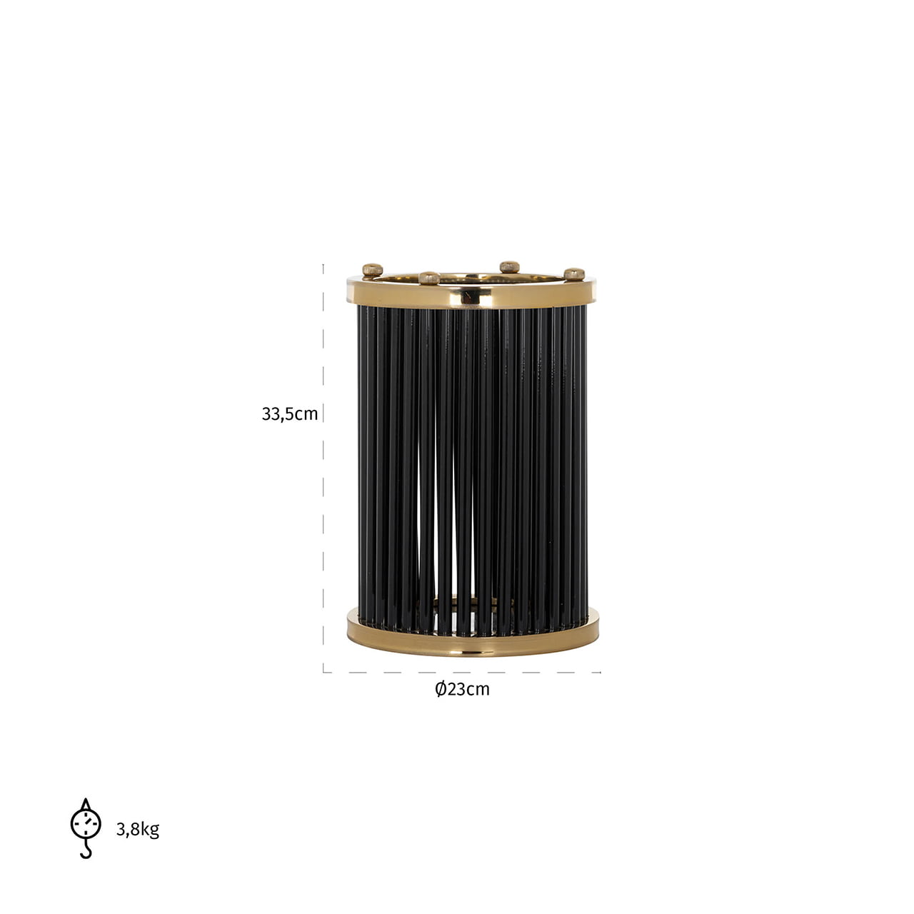 Dit windlicht combineert een glanzend goudkleurig aluminium frame met zwarte buizen, wat zorgt voor een uniek lichteffect wanneer het licht door de buizen schijnt. Het contrast tussen het goud en zwart geeft een verfijnde uitstraling en voegt een vleugje luxe toe aan je omgeving.