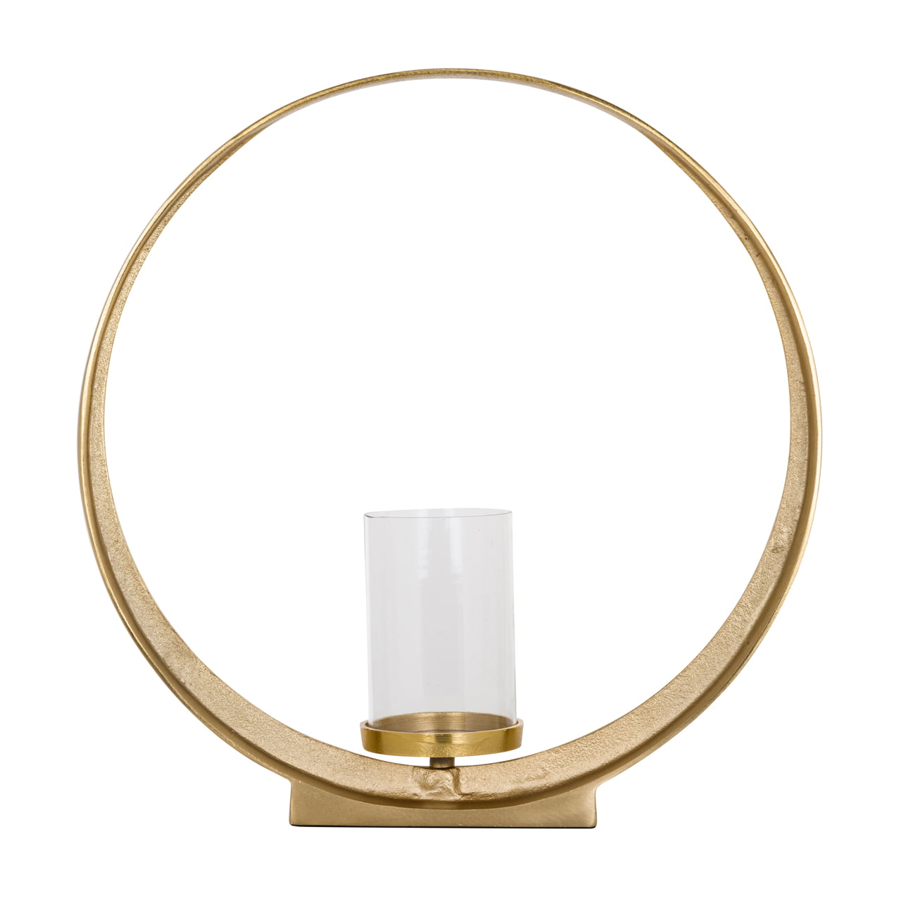 Het Richmond Windlicht Ruan Goud Groot is niet alleen een accessoire, maar een statement. Het indrukwekkende design en de hoogwaardige materialen maken dit windlicht tot een blikvanger in elke kamer. Het glazen omhulsel en het goudkleurige aluminium frame met opengewerkte cirkel creëren een betoverend spel van licht en schaduw, wat resulteert in een warme en uitnodigende sfeer.