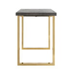 Het blad van de bartafel is gemaakt van zwart eikenhout, wat zorgt voor een verfijnde en tijdloze uitstraling. Het eikenhout heeft een prachtige natuurlijke nerf en geeft de tafel een warme en karakteristieke uitstraling. Het zwarte blad vormt een mooi contrast met het gouden onderstel, waardoor de tafel een moderne en luxe uitstraling krijgt.