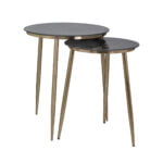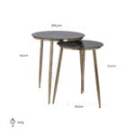 De eerste bijzettafel heeft een doorsnee van 42Ø, terwijl de tweede bijzettafel een doorsnee heeft van 50,5Ø. Beide tafels hebben een compact formaat, waardoor ze perfect passen in elke kamer of zithoek. Het donkere glanzende aluminium tafelblad voegt een vleugje verfijning toe aan het geheel en vormt een prachtig contrast met het brushed goudkleurige stalen onderstel.