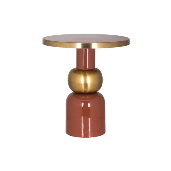 De tafel van de Inaya bijzettafel is uitgevoerd in een elegante gouden kleur, wat zorgt voor een glamoureuze en stijlvolle look. Het opvallende rode blad voegt een levendig accent toe en creëert een boeiend contrast met het gouden frame.